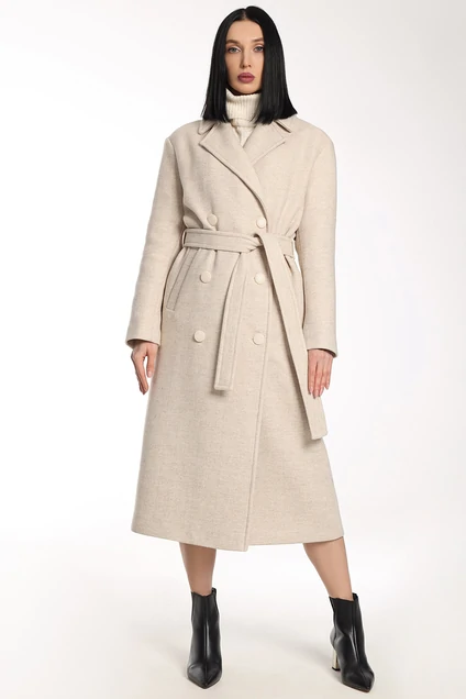 Пальто прямого силуэта, линия плеча спущена. На полочках обработаны карманы с . Спинка со средним швом переходящим в шлицу. Рукав втачной двухшовный. Воротник пиджачного типа. Дополнением является съемный пояс. Пальто на подкладке. длина по спинке: 119 см длина рукава: 58 см