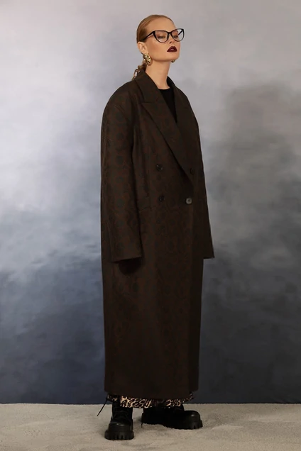 Fashion пальто oversize, выполнено из премиальной, шерстяной пальтовой ткани. Пальто теплое, подходит для очень холодной осени. Прямой силуэт, выполнен по типу “мужской пиджак”. Усиленное удлиненное плечо. Изделие с двубортной застежкой на 4 петли и пуговицы. Воротник пиджачного типа. На полочках нагрудные вытачки, прорезные горизонтальные карманы с листочками, декоративный прорезной карман с отделочной деталью на верхней левой полке пальто. Борта прямые. По спинке средний шов и шлица. Длина до середины икры. Изделие на авторской подкладке.