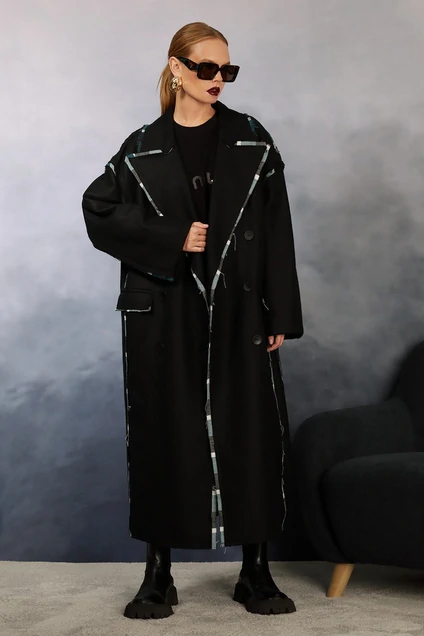 Пальто теплое, подходит для очень холодной осени. Прямой силуэт, спущенная линия плеча. Изделие с двубортной застежкой на 4 петли и пуговицы. Воротник пиджачного типа. На полочках нагрудные вытачки, прорезные карманы в рамку с клапаном, отрезной бочок. Борта прямые. По спинке средний шов и шлица. Длина до середины икры. Изделие на хлопковой подкладке с небольшим начесом. Все швы внутри окантованы. Дизайнерская вышивка на спинке изделия. Отделочные необработанные элементы по всем срезам пальто.