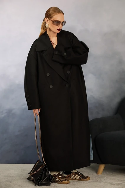 Прямой силуэт, длина maxi. Спущенная линия плеча. Изделие с двубортной застежкой на 4 петли и пуговицы. Воротник объемный, пиджачного типа. На полочках нагрудные вытачки, прорезные карманы с листочками. Борта прямые. Спинка выполнена из плотного хлопкового джинса. На спинке кокетка и вертикальные подрезы. По низу спинки притачная планка и отделочные хлястики. Рукав втачной ,одношовный. По центру встречная складка, по низу шлица с декоративными пуговицами.
