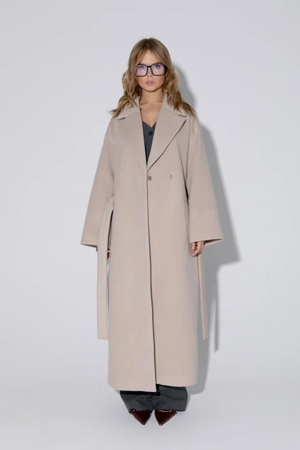 Свободное пальто-халат длины макси. Детали: прямой силуэт, спущенная линия плеча, перед с прорезными карманами, пиджачный воротник, двубортная застежка на пришивные кнопки, рукава длинные, съемный пояс со шлевками, пальто на подкладке