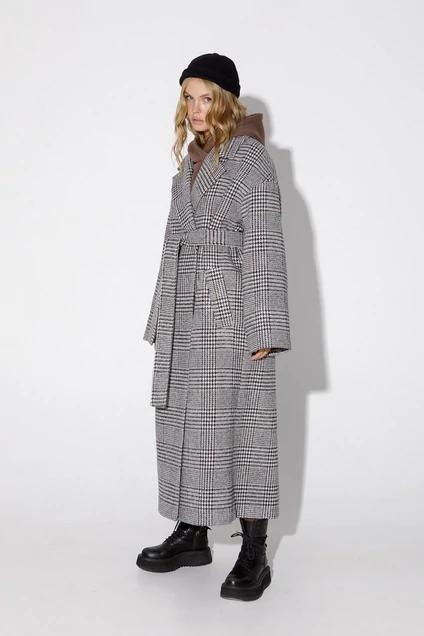 Свободное пальто-халат длины макси. Детали: прямой силуэт, спущенная линия плеча, перед с прорезными карманами, пиджачный воротник, двубортная застежка на пришивные кнопки, рукава длинные, съемный пояс со шлевками, пальто на подкладке