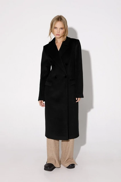 Двубортное пальто со шлицей. Детали: полуприлегающий силуэт, талиевые вытачки, пиджачный воротник, перед с прорезными карманами с клапанами, отрезные бочки, застежка на петли и декоративные пуговицы, спинка со средним швом, втачные длинные рукава со шлицей, пальто на подкладке.