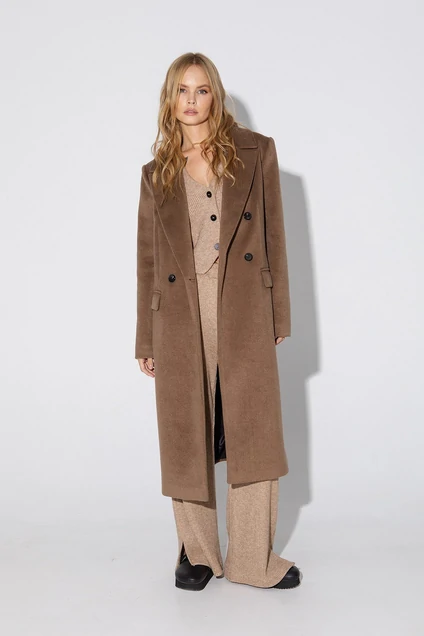 Двубортное пальто со шлицей. Детали: полуприлегающий силуэт, талиевые вытачки, пиджачный воротник, перед с прорезными карманами с клапанами, отрезные бочки, застежка на петли и декоративные пуговицы, спинка со средним швом, втачные длинные рукава со шлицей, пальто на подкладке.