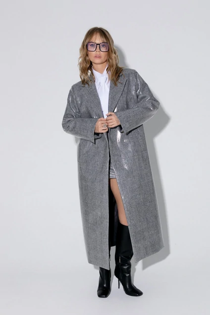 Детали: прямой силуэт, свободный покрой, расширенный плечевой пояс, пиджачный воротник, двубортная застежка на петли и пуговицы, рукава втачные со шлицей, функциональные карманы, спинка со средним швом и высокой шлицей, пальто на подкладке.