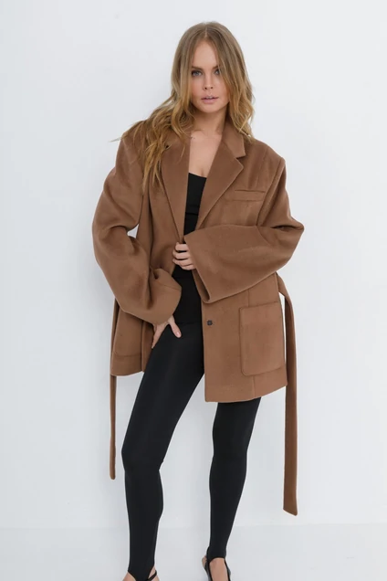 Детали: свободный покрой, полуприлегающий силуэт, расширенные плечи, рельефы переда и спинки, пиджачный воротник, застежка на пришивные кнопки, функциональные карманы, рукава длинные широкие, съемный пояс, на подкладке.