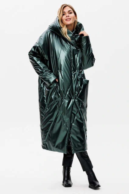 Пальто женское с капюшоном, на утеплителе ISOSOFT (200 г/м2 Бельгия), свободного силуэта зауженное к низу. По переду и спинке прострочены декоративные строчки. По переду расположены накладные карманы, плечо спущенное, рукав одношовный. Лацкан куртки переходит в капюшон. Пальто застегивается на пришивные кнопки.