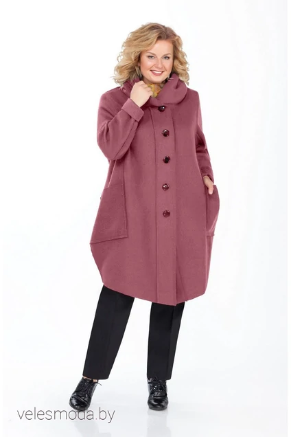 Пальто свободного кроя с рукавами в полную длину, с центральной бортовой застежкой на петли-пуговицы, накладными карманами и капюшоном. Швы изделия выполнены накладными, с открытыми срезами. Спинка с рельефами из проймы. Пальто без подкладки.