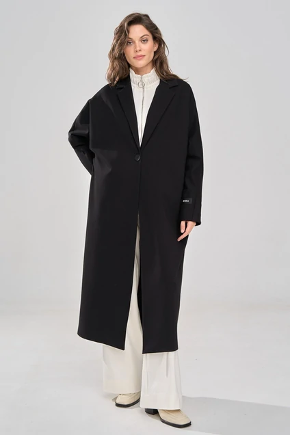 Пальто свободного силуэта с цельнокроеными рукавами и центральной бортовой застёжкой на петли- пуговицы. Воротник пиджачного типа. Спинка со средним швом и шлицей. В боковых швах карманы. По спинке и левому рукаву авторская печать. В комплекте съёмный пояс.