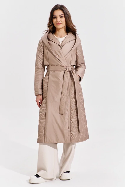 Пальто свободного кроя, длиной чуть выше середины икры. По спинке отлетная кокетка. Перед с рельефами от пройм до низа. Центральная часть с цельнокроеным капюшоном. По боковой части отлетная кокетка и карманы. В рельефы вставлена деталь из отделочной ткани с цельнокроеным объемным капюшоном. Рукава двушовные, втачные, длинные. Застежка по переду на кнопки. По боковым, на уровне талии настрочены шлевки, в которые вставлен съемный пояс.