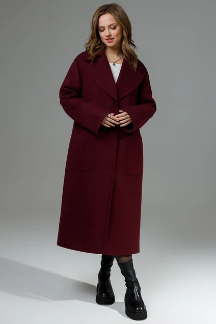 Пальто свободного силуэта с накладными карманами. Пиджачный воротник, втачной длинный рукав, центральная застежка на потайные кнопки. Спинка со средним швом со шлицей. Пояс в комплекте. Пальто на подкладке.