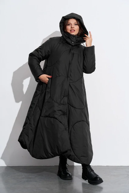 Длинное пальто на утеплителе, со стойкой и съёмным капюшоном. Детали спинки и переда собраны из хаотично отстроченных ,фигурно разрезанных частей. Карманы прорезные на молнии, застёжка на кнопках. Рукава одношовные. Низ переда и спинки фигурный. Изделие на подкладке.