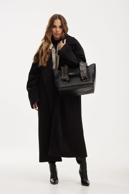 Пальто объемной формы из плотной пальтовой ткани. Длина макси. Воротник пиджачного типа. Пальто на запах, фиксируется завязывающимся поясом. На переде прорезные карманы. Рукав прямой свободный. Пальто