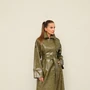 Плащ актуального прямого силуэта, выполнен из плотной экокожи с тиснением. Воротник пиджачного типа с отложными лацканами. Двубортная застёжка на петли и пуговицы. По плечевому шву обработаны погоны. Спереди отлетная кокетка и наклонные карманы с листочкой. Рукава кроя реглан, с патами по низу, с фиксацией на пуговицы. Спинка со средним швом. Для удобства движения сзади обработана шлица. Тренч на подкладке. В комплекте пояс из основной ткани с пряжкой.