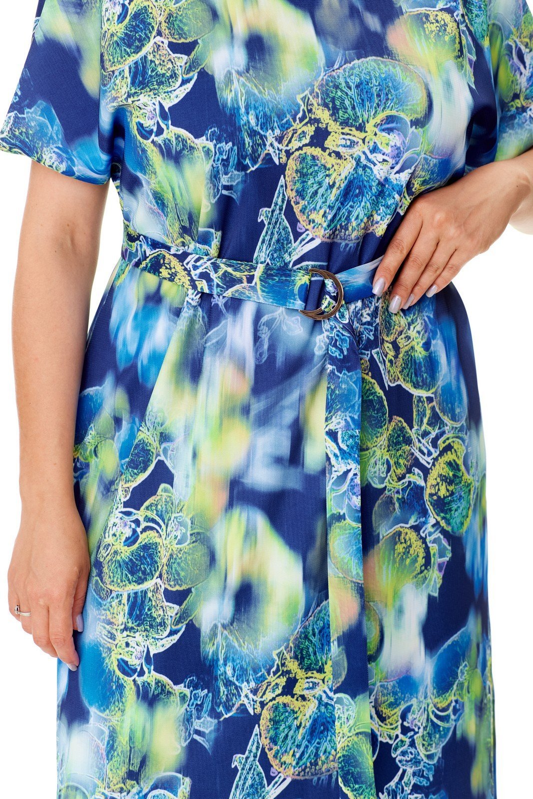 Платье женское свободного кроя со спущенным коротким рукавом. Горловина в форме «лодочки», обработана обтачкой, по горловине отделочная строчка. В боковых швах рабочие карманы. В комплект входит пояс из основной ткани.