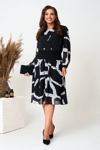 Стильный комплект, состоит из джемпера и платья. Джемпер полуприлегающего силуэта, выполнен из трикотажного крепа с добавлением вискозы. Джемпер декорирован двумя пришивными пуговицами, низ и рукава с отделкой из трикотажного довяза. Платье полуприлегающего силуэта, расширенное к низу, выполнено из высококачественного шифона с модным дизайнерским принтом. Платье отрезное по талии со сборкой на резинке, полностью на трикотажной подкладке. Вырез горловины округлый, по спинке небольшой вырез капелька с застежкой на пуговицу. Рукава втачные, по низу собраны на узкую резинку. Модель удобная и практичная, прекрасно подойдет для ежедневной носки, а также для торжественного мероприятия. Подкладка трикотажная ПЭ 100%.