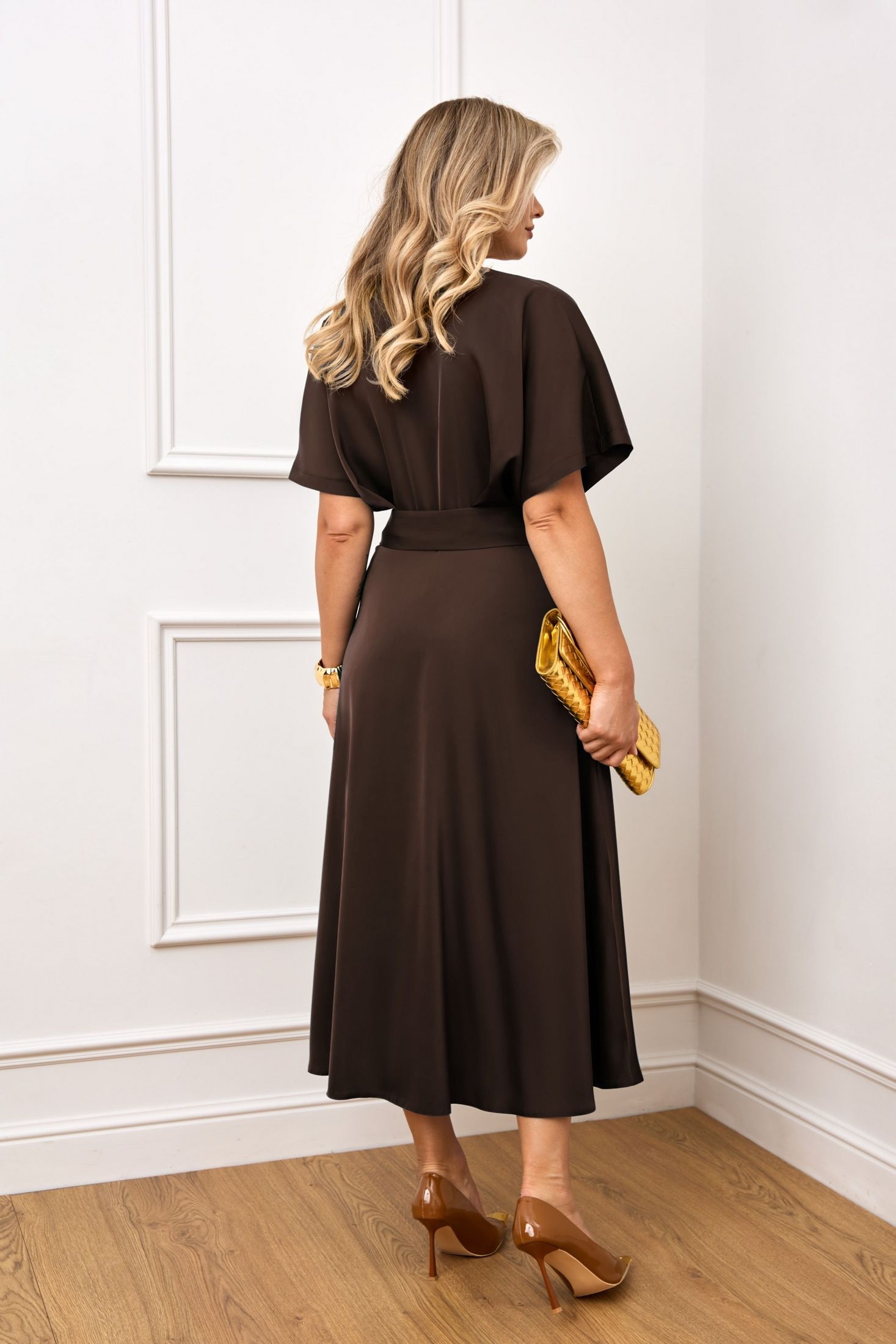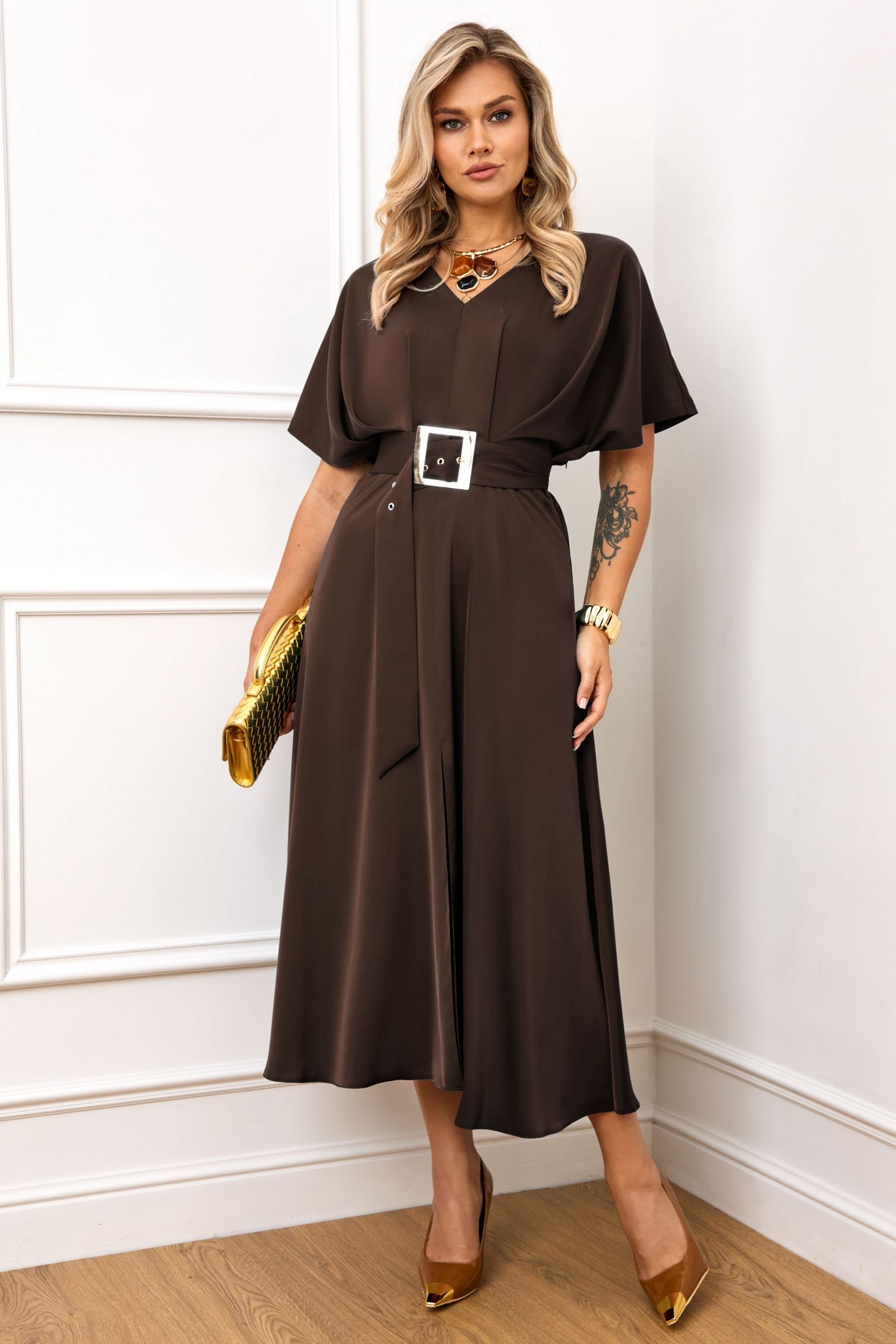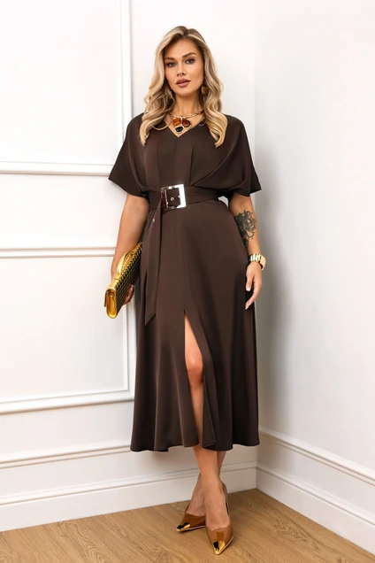 Платье 5398-11 AGATTI — это элегантное нарядное платье из коллекции бренда AGATTI. Изготовлено из качественной ткани с добавлением вискозы, оно мягко облегает фигуру, обеспечивая комфорт и стиль. Модель имеет V-образный вырез, акцентированную талию и расклешённую юбку с разрезом, что придаёт образу особую изысканность. Платье дополнено съёмным поясом с золотой пряжкой, скрытой молнией и объёмными рукавами с спущенной линией плеча. Удачный выбор для осени, оно идеально подойдёт для праздничных мероприятий и вечерних выходов, подчёркивая вашу яркость и обаяние. Благородный коричневый цвет гармонично дополняет общий образ.