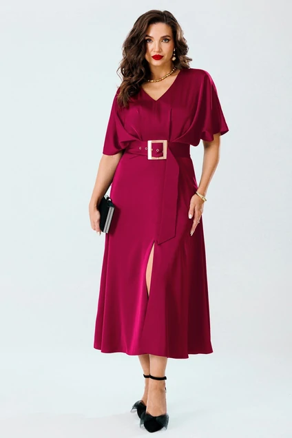 Элегантное нарядное платье, выполнено из роскошной струящейся плательной ткани с добавлением вискозы. Платье с V-образным вырезом горловины, отрезное по линии талии. Верхняя часть платья выполнена в свободном стиле со спущенной линией плеча и глубокими складками на линии талии, что придает платью особый стиль и шарм. Юбка платья с расклишением, по переду с разрезом. В боковом шве платья потайная молния застежка. Рукав цельнокроеный, объёмный, со спущенной линией плеча. В комплекте к платью идет съемный пояс с шикарной золотой пряжкой. Модель удобная и практичная, вы будете в нем выглядеть неотразимо и нарядно.
