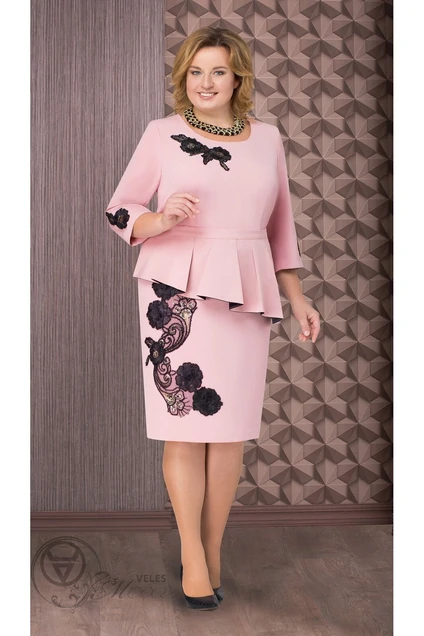 Платье женское нарядное из однотонной приятной на ощупь эластичной ткани; полуприлегающего силуэта, слегка зауженное к низу; с горловиной круглой формы; с застежкой на потайную тесьму-«молнию» в боковом шве; с плечевыми накладками. Перед с нагрудными и талиевыми вытачками. Спинка с талиевыми вытачками и средним швом, оканчивающимся разрезом. Длина по центру спинки 105 см. Рукава втачные, двухшовные, длиной ¾. Длина рукава 45 см. Горловина обработана обтачкой. Рукава и перед по низу и горловине декорированы аппликациями из ажурного кружева. Платье дополняет съемная баска с асимметричной линией низа на притачном поясе, застегивающемся на одну обметанную петлю и одну пуговицу. По передней части баски заложены складки. Баска обработана подкладкой контрастного цвета. Перекант подкладки на лицо по низу баски служит отделочным элементом. Платье можно носить как с баской, так и без баски.