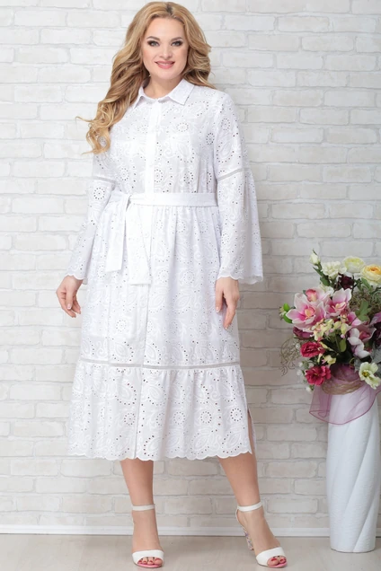 Платье женское , белого цвета, из хлопчатобумажной ткани с шитьем; полуприлегающего силуэта, слегка расклешенное к низу. Платье на хб подкладке, без плечевых накладок. По низу пришит волан с феленчатым краем. Перед с нагрудными вытачками. Длина по центру спинки 120 см. Рукава втачные, одношовные. Длина рукава 62 см. Застегивается на петои пуговицы , воротник рубашечный.