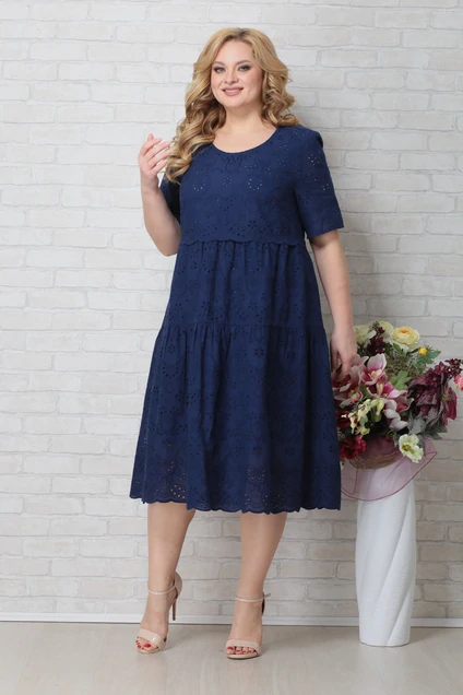 Платье женское свободного силуэта выполено из хлопковой ткани «шитье», синего цвета, платье на подкладке – 100% хб ,с плечевыми накладками. Перед с нагрудными вытачками. Рукава втачные, одношовные. Платье отрезное ниже линии груди, по низу пришито два волана с филенчатым краем. Длина платья 112 см. Длина рукава 29 см. Горловина круглой формы, обработана обтачкой.