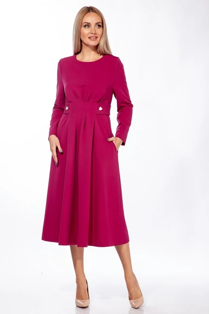 Подчеркнутая линия талии, эффектный цвет, любимая длина "миди" - идеальный вариант для современных модниц! Платье женское с застёжкой на тесьму-молнию в среднем шве спинки, в боковых швах карманы, по боковым на уровне линии талии переда и спинки пояс, застёгивающийся на петли и пуговицы выходящий из боковых складок. Перед и спинка по центру линии талии с застроченными мягкими складками. Рукава втачные, одношовные, длинные.