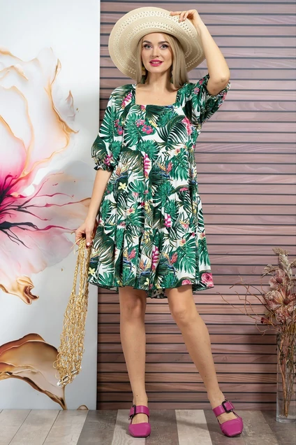 Платье женское отрезное чуть выше линии талии и тремя притачными оборками со сборкой по линии соединения, с имитацией бретели на продолжении проймы собранная на резинку. Перед с нагрудными выточками. Рукава втачные, одношовные, длиной3/4, объёмной формы за счёт сборки по окату и понизу собранный на резинку (настроченная на расстоянии 2,5см от низа).