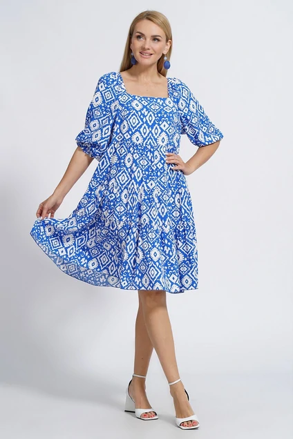 Платье отрезное чуть выше линии талии и тремя притачными оборками со сборкой по линии соединения, с имитацией бретели на продолжении проймы собранная на резинку.