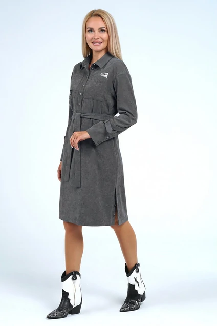 Платье прямого силуэта, с поясом, со спущенной линией плеча, с застёжкой верху переда и понизу боковых с втачными планками на петли, пуговицы. Перед с накладными нагрудными карманами декорированы нашивками. Спинка со средним швом. Рукава втачные, одношовные, понизу с разрезом, мягкой складкой, притачными манжетами  застёгивающиеся на две петли и пуговицы и патами застёгивающиеся на два полукольца. Воротник стояче-отложной на отрезной стойке на петлю, пуговицу.