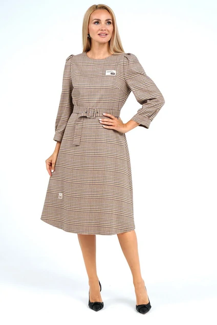 Платье полуприлегающего силуэта верху расширенное книзу, отрезное по линии талии, с застёжкой на потайную тесьму-молнию в среднем шве спинки, с завязывающимся поясом. Перед с нагрудными выточками. Спинка по верхней части с талевыми выточками. Рукава втачные, одношовные, длиной ¾, по окату и низу с мягкими складками с притачными манжетами. Декорировано нашивками по верхней и нижней части переда. Ткань костюмно-плательногог ассортимента.