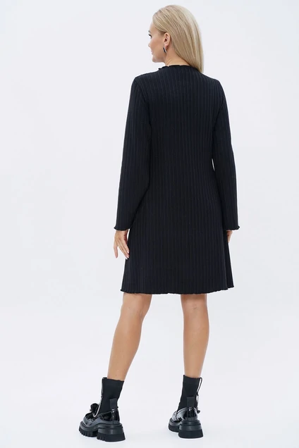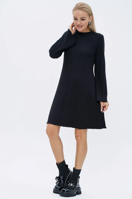 Платье А-образного силуэта с расширением книзу, с цельнокроеной стойкой, с втачными, одношовными, длинными рукавами книзу расширенные. Горловина, низ изделия и рукава обработаны узкой краеобмёточной строчкой «флешь». Трикотажное полотно.