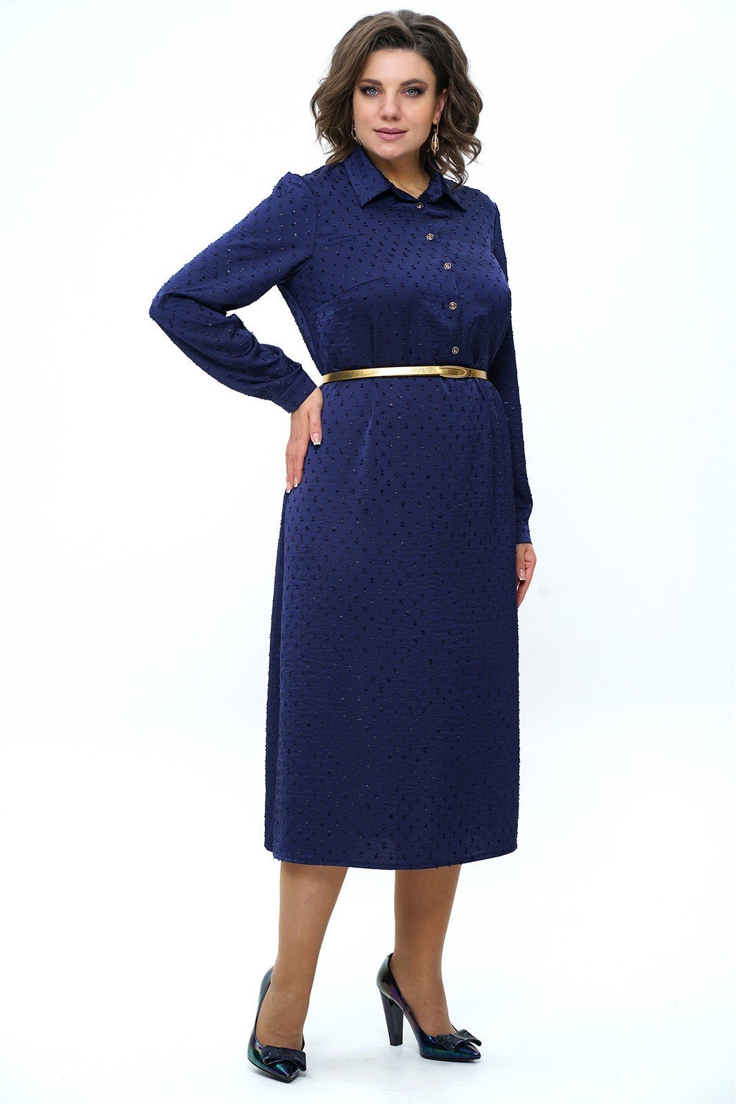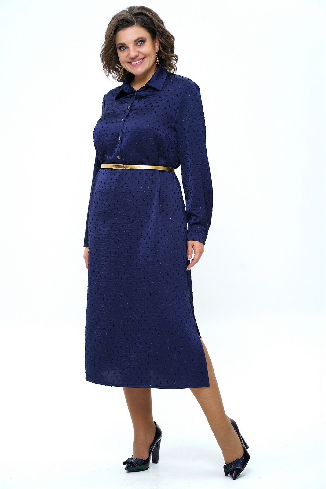Платье женское полуприлегающего силуэта верху с расширением к низу, отрезное по линии талии, с завязывающимся поясом и в дополнении ремень. С застёжкой по планке на петли и пуговицы, по боковым разрезы. Перед с нагрудными выточками. Рукава втачные, одношовные, длинные, понизу с разрезом, двумя мягкими складками и притачными манжетами на петлю и пуговицу. Воротник стояче-отложной на отрезной стойке застёгивающийся на петлю и пуговицу. Ткань платьево-костюмного ассортимента.