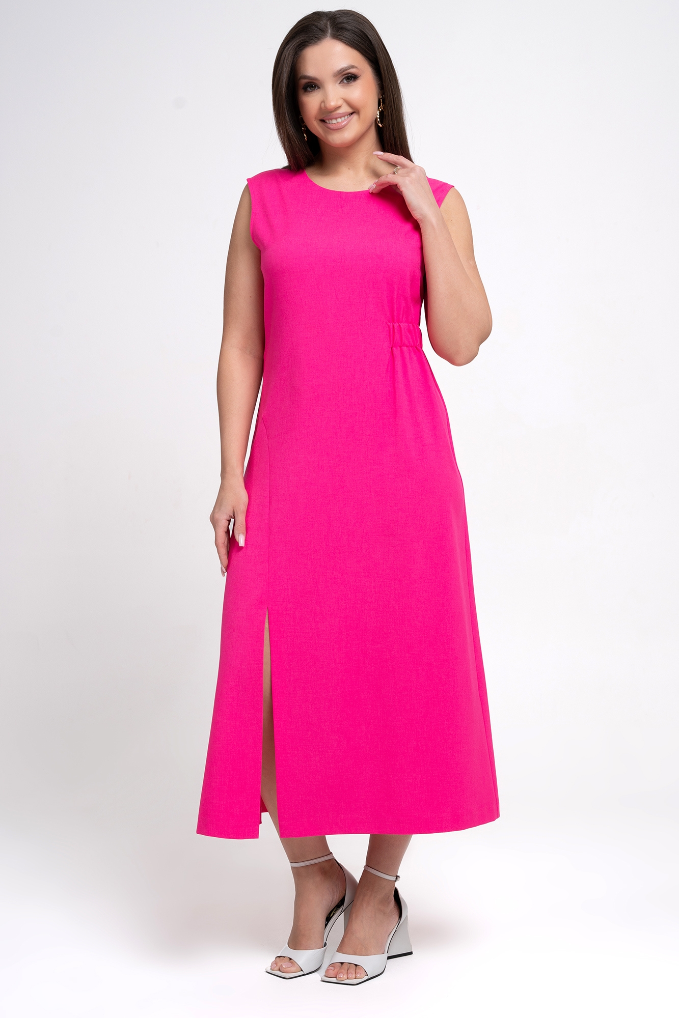 Платье женское полуприлегающего силуэта верху с расширением книзу, без рукавов, с застёжкой на потайную тесьму-молнию в среднем шве спинки, по линии талии левого бокового шва резинка фиксируемая степень прилегания частично переда и спинки.