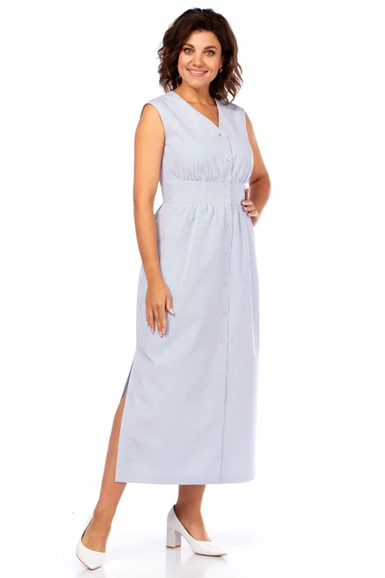 Платье с притачным поясом по линии талии и со сборкой по шву соединения, с застёжкой на петли, пуговицы, чуть спущенное плечо, с карманами в боковых швах и разрезами по низу. Декорировано съёмным украшением.