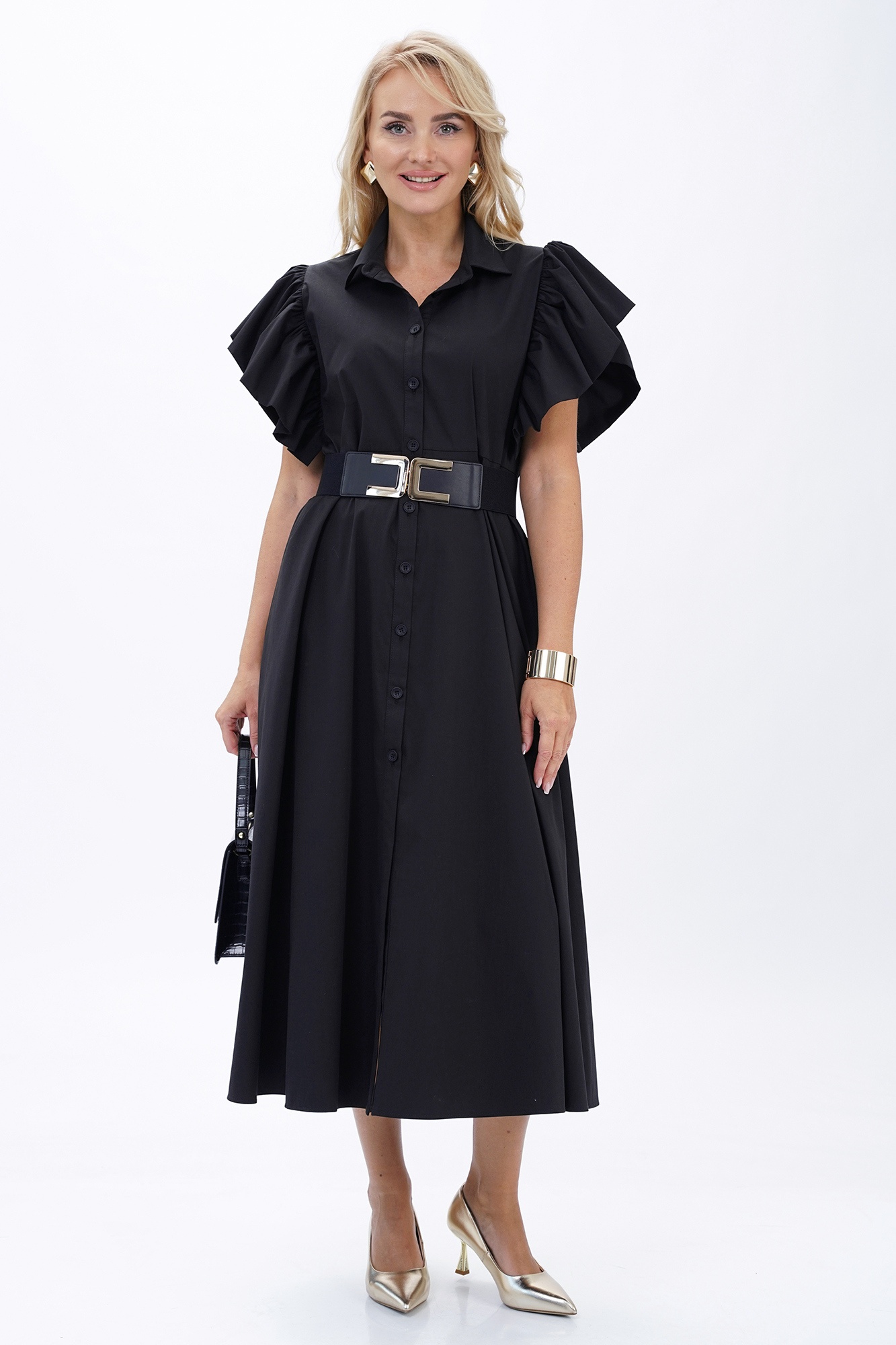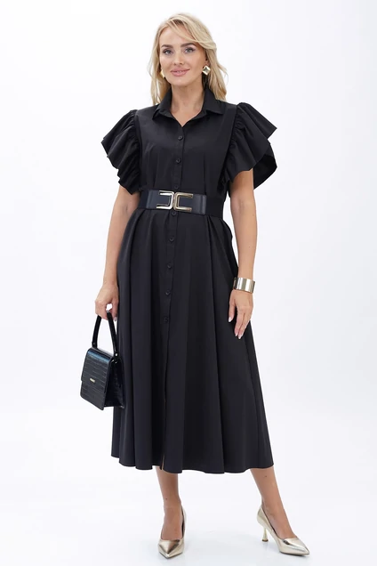 Платье 2445 черный ALANI — это идеальный выбор для стильного и современного гардероба. Коллекция бренда ALANI предлагает вам наряд, который сочетает в себе элегантность и комфорт. Изготовлено из высококачественного хлопка с добавлением спандекса, платье обеспечивает свободу движений и удобство. Полуприлегающий силуэт с расширением книзу дополняется отрезной талией и акцентируется поясом. Короткие рукава-крылышки и стояче-отложной воротник на отрезной стойке добавляют изюминку образу. Черный цвет делает платье универсальным выбором для любого события — от работы до вечеринки. Длина изделия по спинке гармонирует с вашим образом, создавая элегантный силуэт.