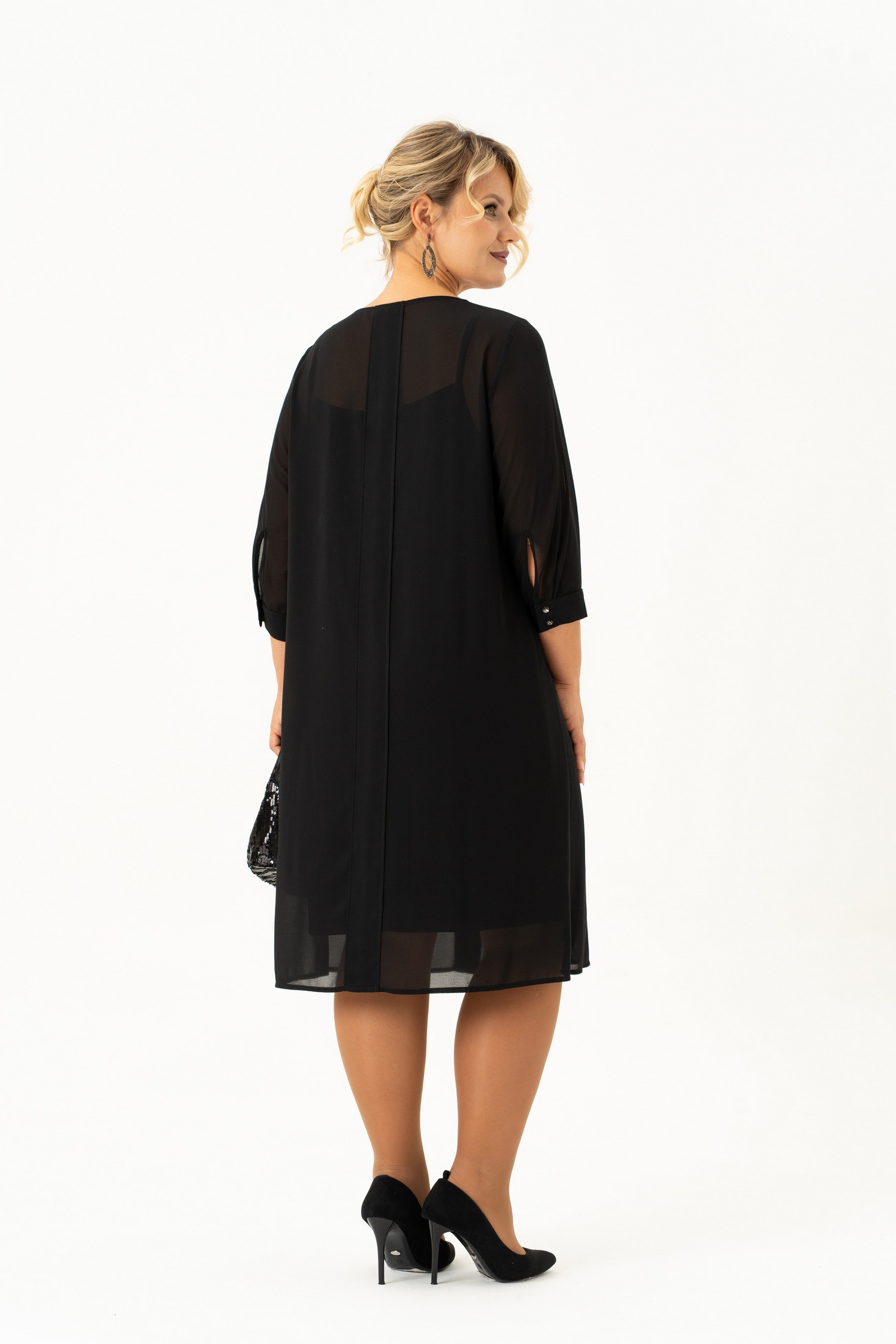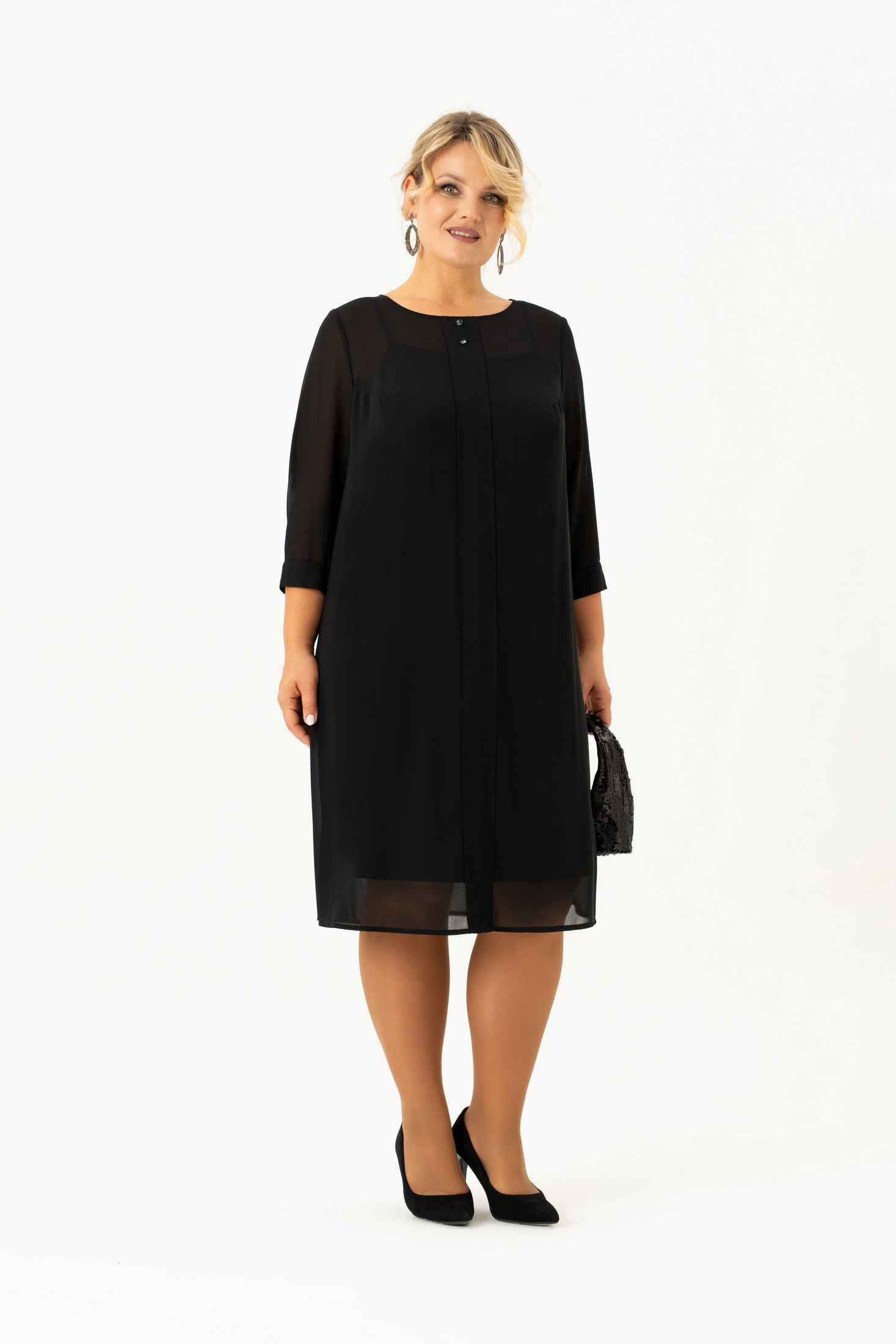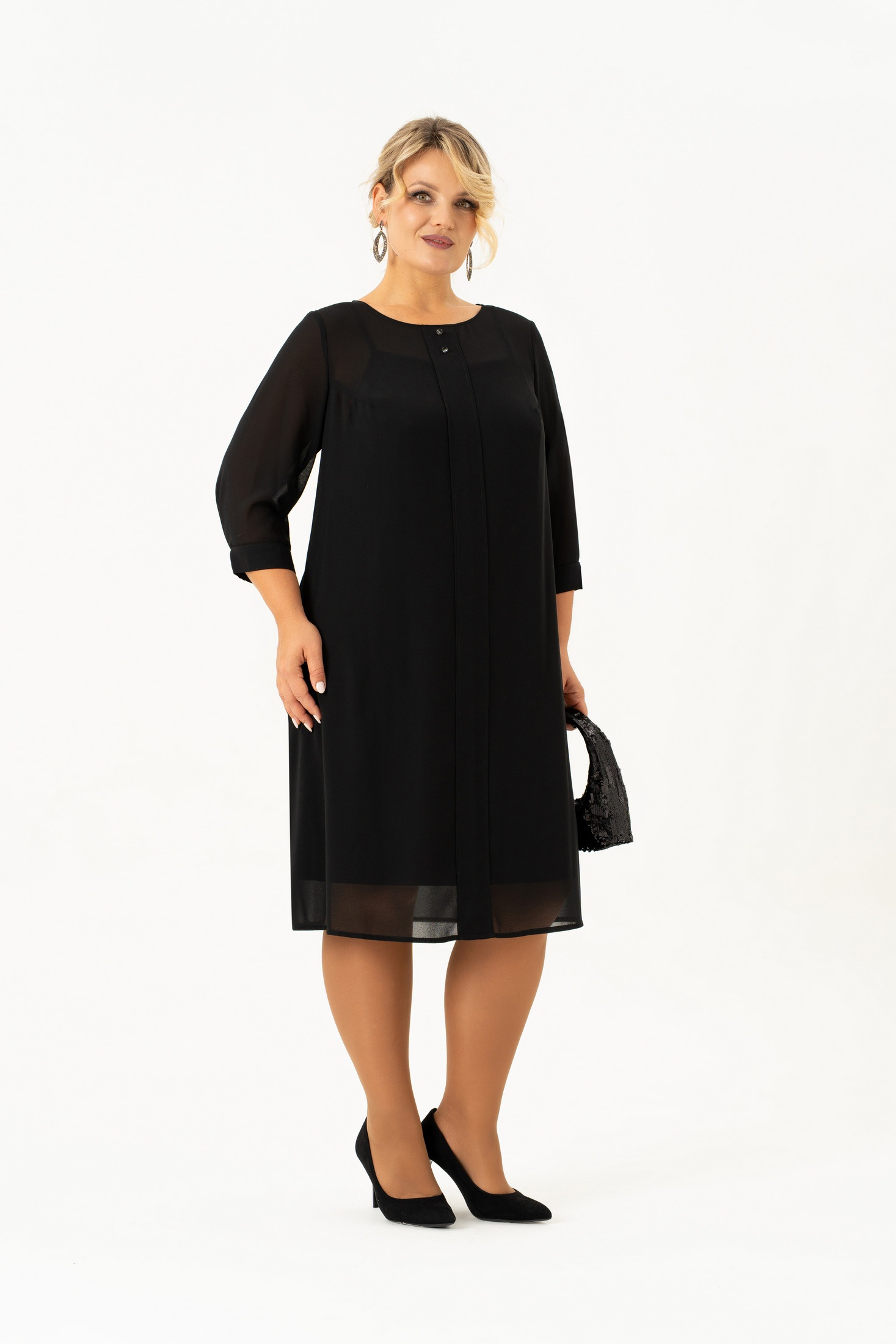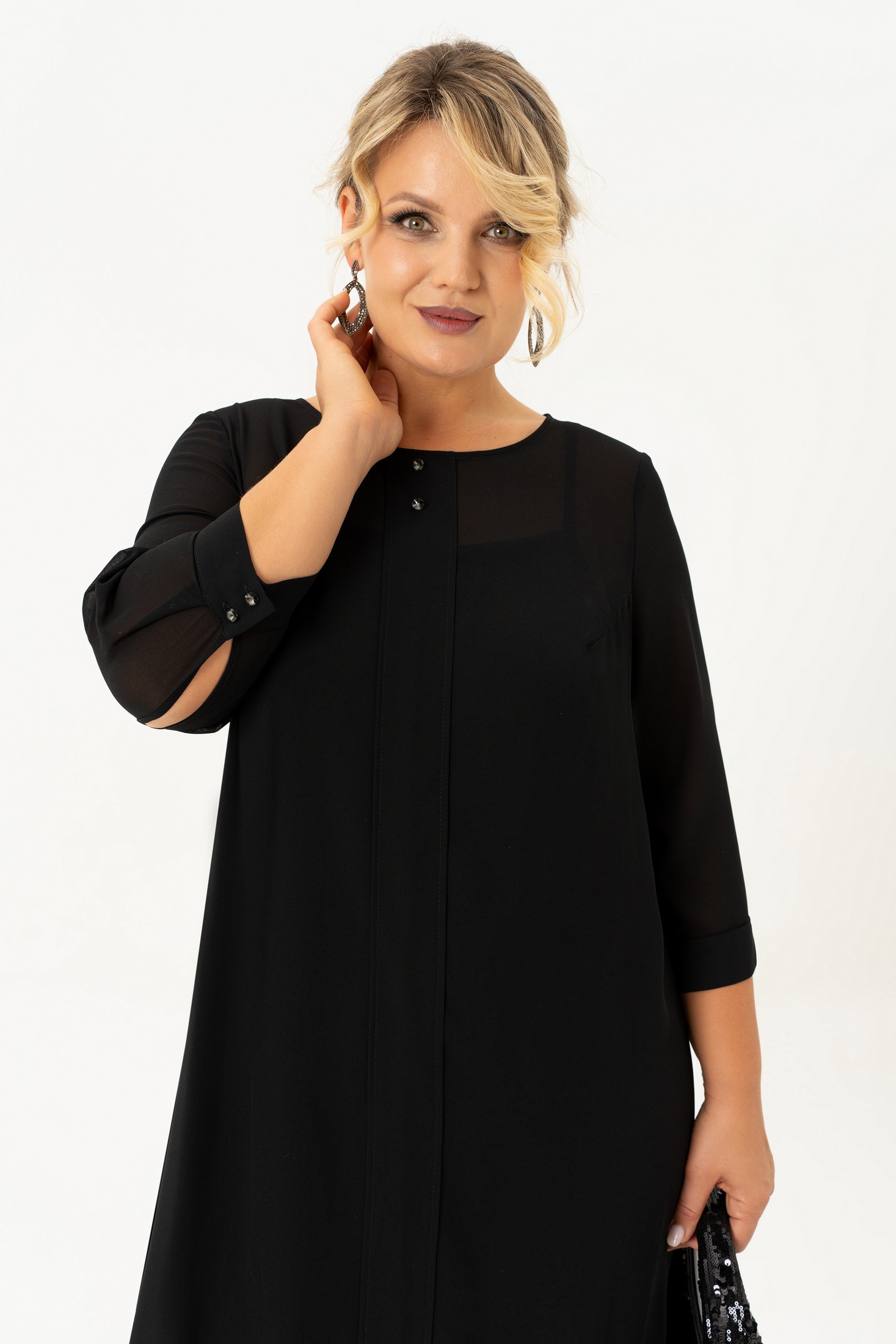 Нарядно повседневное, универсальное, элегантное черное платье с рукавом длиной ¾ на манжете и отдельным подкладом поможет Вам в создании абсолютно разных образов. Платье имеет классический прямой крой с бантовыми складками по переду и по спинке, которые добавляют романтичность и элегантность. Платье подойдет как высоким, так и невысоким женщинам, благодаря своей миди длине. Верхнее платье выполнено из шифона, горловина декорирована пуговицами. Нижнее платье из ткани "масло" на бретелях. Это платье Вы можете легко использовать как вечернее, платье для прогулки или на свидание, на день рождения или клуб, для фотосессии или романтического вечера. Такое платье будет уместно в любом гардеробе. Длина изделия (см): 106 Длина рукава (см): 47