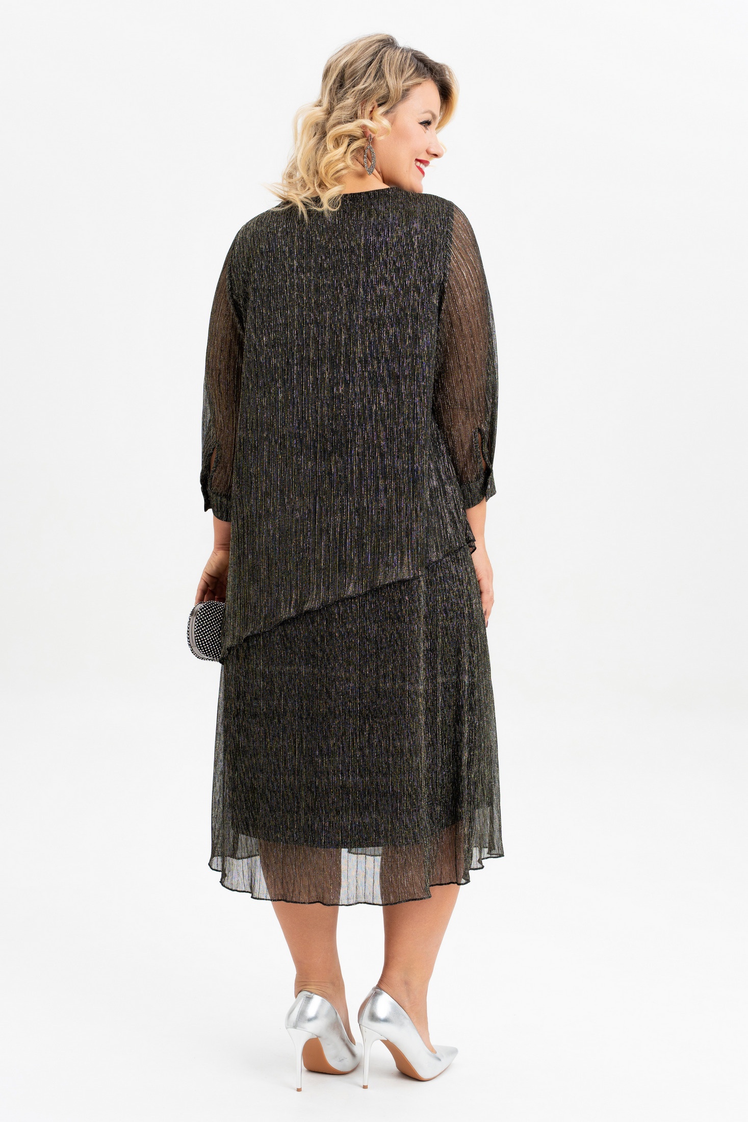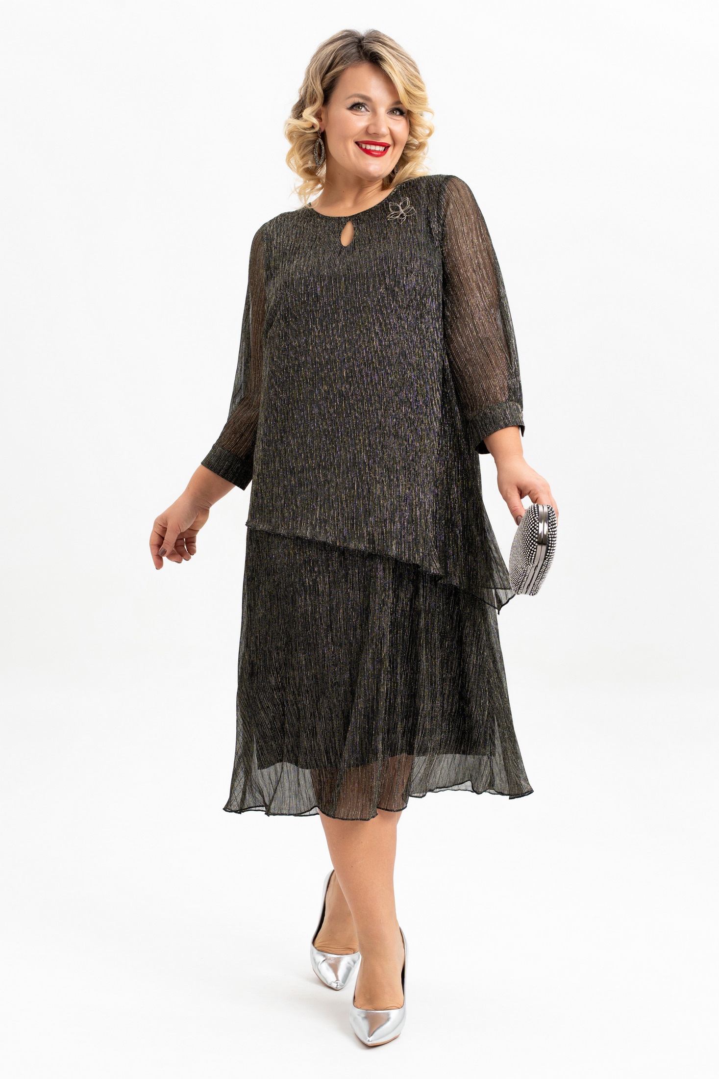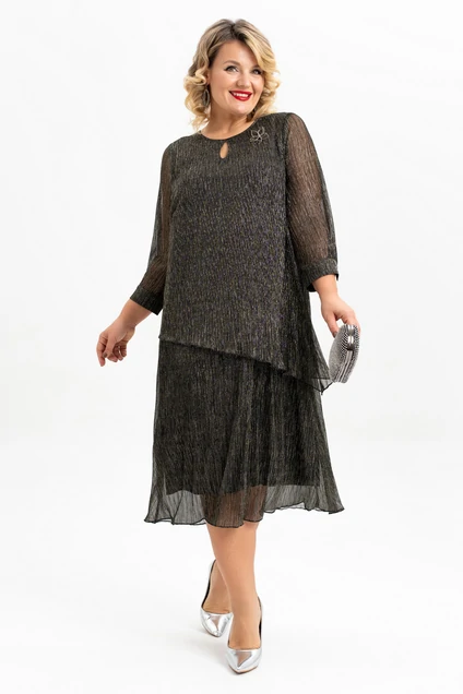 Это итальянское платье- имитация костюма нарядного стиля больших размеров станет отличным выбором для тех, кто ценит элегантность и стиль. Платье сочетает в себе комфорт и долговечность. Ткань "плиссе" придает изделию оригинальную рельефную текстуру, которая делает его особенно привлекательным. Основная особенность этого платья — силуэт в виде трапеции, который подходит для разных типов фигур, а также каплевидный декор по горловине полочки. Длина юбки — миди. Платье предназначено для женщин плюс сайз и станет идеальным выбором для вечерних мероприятий, новогодних праздников, свадеб или юбилеев. Благодаря универсальному дизайну ее можно сочетать с различными нарядами. Это отличный подарок для жены, мамы, сестры или девушки. Платье украшено брошей-цветком и съемным поясом, которая добавляет элегантности и шарма, и ее можно заменить на другие аксессуары, адаптируя наряд под разные события и настроения. Легкая трикотажная подкладка делает его еще более комфортным, а рукава 3/4 и рубашечный манжет с застежкой на петлю и пуговицу делают платье подходящим для большинства женщин. Выбирая это платье больших размеров , Вы получаете не только стильное и элегантное платье, но и качественное удобное изделие, которое скрывает все неровности фигуры и будет Вашим верным спутником на любых праздниках .