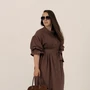 Платье женское, свободного кроя из лёгкой плательной ткани, длиной миди. Перед с декоративными отстроченными продольными складочками-защипами и цельнокроённой планкой с центральной застёжкой на петли и пуговицы. Плечо спущенное, рукав объёмный, длиной 7/8 с резиночкой, создающей эффект валанчика и позволяющей создать изящный рукав 3/4.В боковых швах имеються функциональные карманы. Вырез горловины круглый с втачной стойкой-воротником. Платье со съёмным поясом из основной ткани. Рост 164-170 см Размер 44 88-70-96 Размер 46 92-74-100 Размер 48 96-78-104 Размер 50 100-82-108 Размер 52 104-86-112 Размер 54 108-90-116 Размер 56 112-94-120