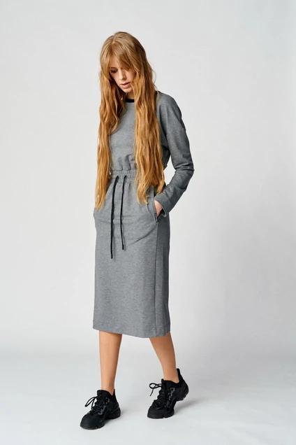 Элегантное платье из мягкого трикотажа,выполнено в спортивном стиле. Платье прямого силуэта со спущенными рукавами и декоративными нашивками в верхней части спинки возле горловины.Горловина овальной формы, в которую вставлен воротник-стойка из довяза. По линии талии широкая притачная кулиса, в которую продет декоративный шнур.В боковых швах-карманы.Спинка лифа со средним швом.Рукава длинные с разрезами на внутренних швах. Длина изделия по спинке: 113 см Длина рукава от горловины: 71 см Длина рукава от проймы: 46 см Параметры в 44 размере: 108см, ОТ80 см, ОБ 112см; параметры в 46 размере ОГ 112 см, ОТ 84 см,Ю ОБ 116см.Параметры в 48 размере: ОГ 116см, ОТ 88 см, ОБ 120см