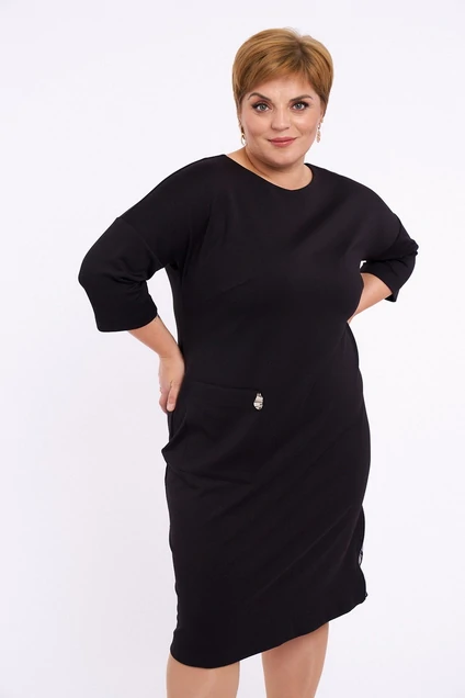 Платье женское, полуприлегающего силуэта, выполнено из трикотажной ткани, используя в качестве декора элементы из кружевной ткани. Вырез горловины овальный, по спинке выполнена капелька и застёжка на воздушную петлю и пуговицу. По переду расположены нагрудные вытачки. Линия плеча спущена, рукав втачной. В качестве декора используется по переду справа накладной карман с пришивным декором, а также в левом боковом шве расположена тесьма-молния и клин из кружевной ткани, который становится видимым при расстёгивании молнии. Платье может быть нарядным, использоваться для работы в офисе, удобное, силуэт скрывает недостатки и подчёркивает достоинства фигуры, за счёт качеств трикотажа, приятное на ощупь и не сковывает движение. Длина платья по спинке 107 см, длина рукава от горловины 49 см Параметры в 50 размере: ОГ 107 см, ОТ 104 см, ОБ 116см; параметры в 52 размере: ОГ 111см, ОТ 108см, ОБ 120см, параметры в 54 размере: ОГ 115см, ОТ 112см, ОБ 124