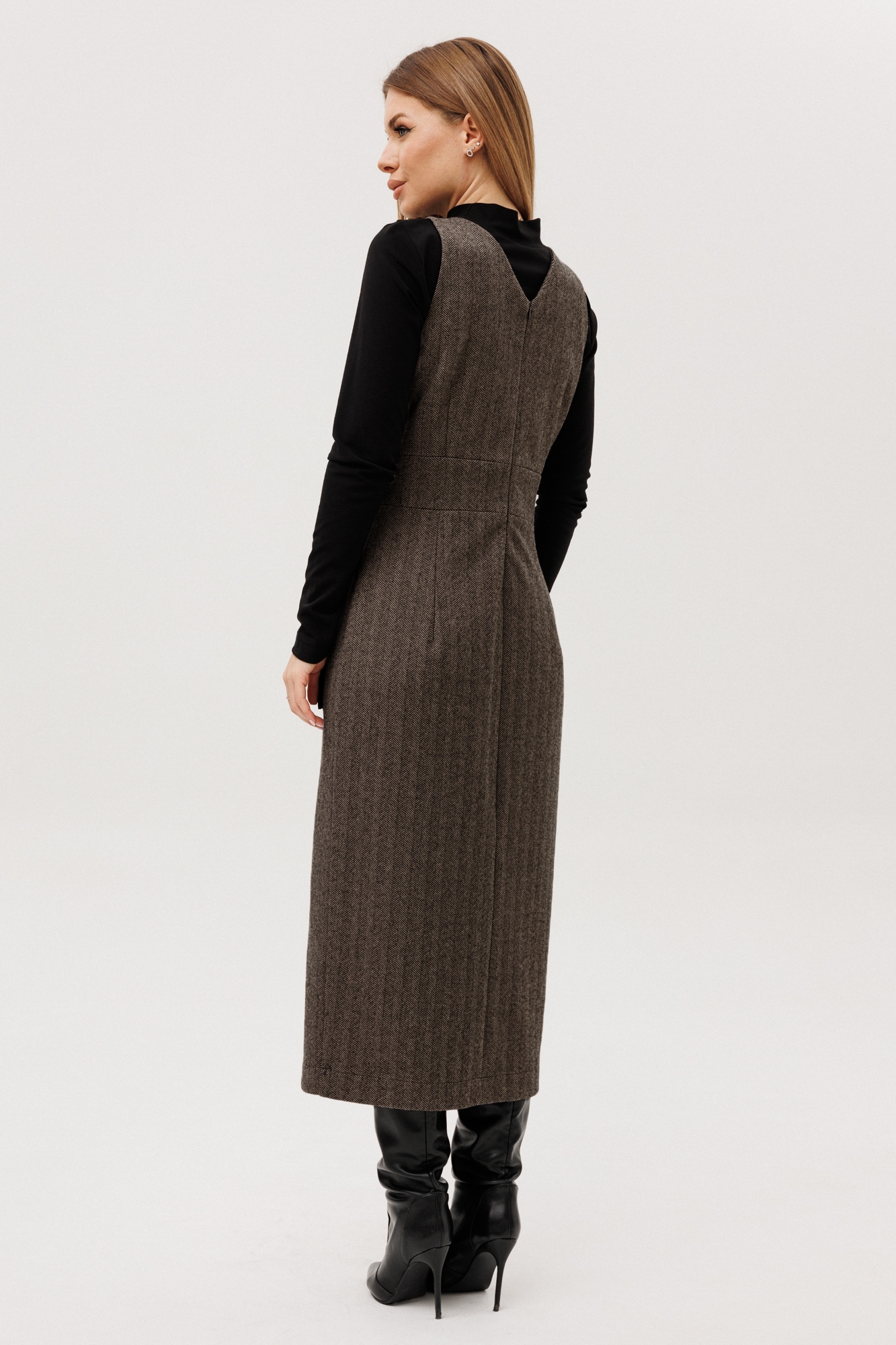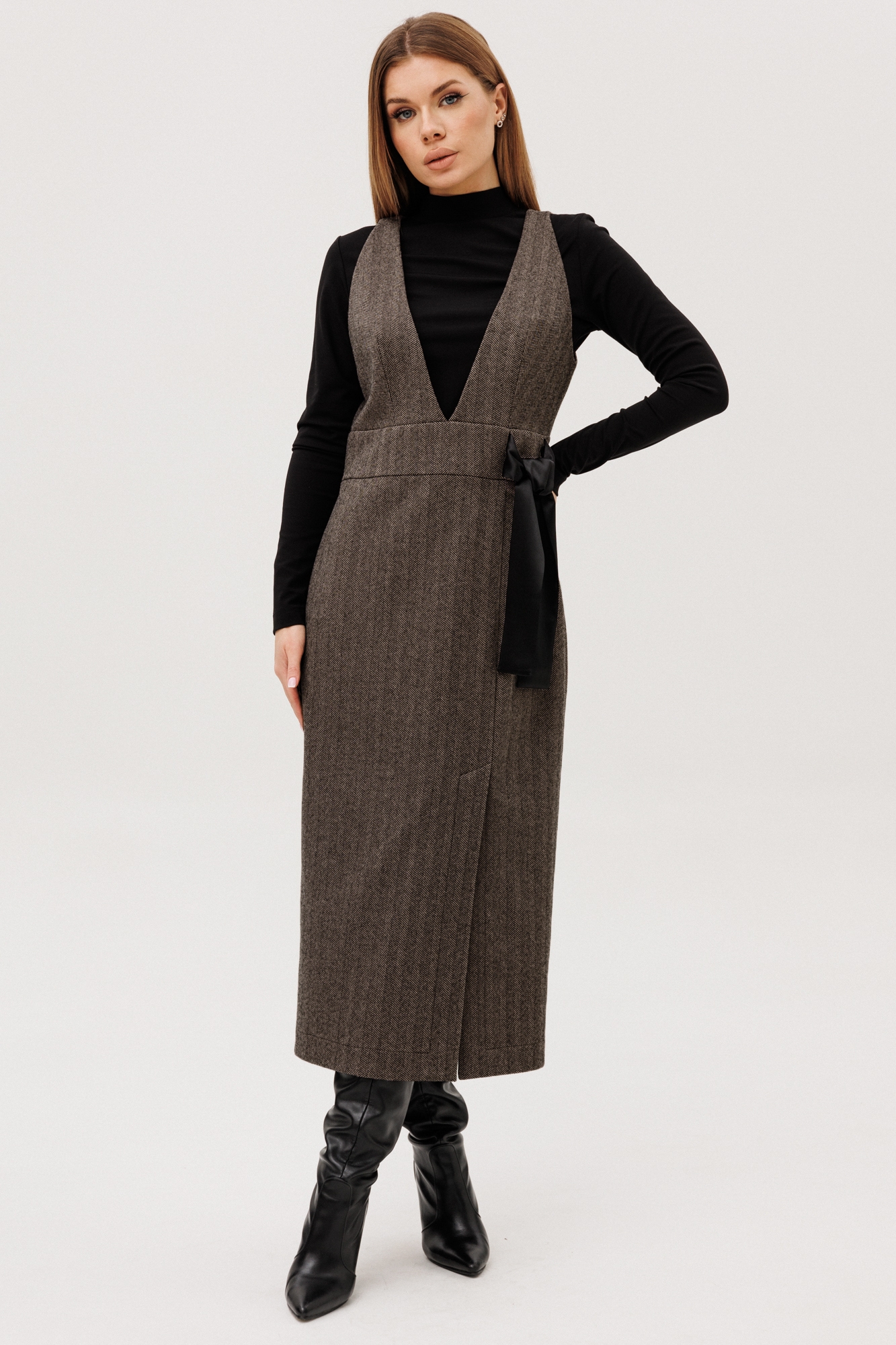 Платье-сарафан 1132 Ambera style — это отличный выбор для стильных женщин. Коллекция бренда Ambera предлагает элегантный сарафан миди длины в классическом стиле. Изготовлен из качественных материалов: кашемира и шерсти, с добавлением полиамида и спандекса, что обеспечивает тепло и комфорт в осеннее и зимнее время. Прилегающий силуэт подчеркивает фигуру, а V-образный вырез и вытачки на лифе добавляют женственности. Декоративный бант из атласной черной ткани на поясе придает шарм, а разрез по переду и молния на спинке делает модель удобной в носке. Отличное решение для работы и деловых встреч, а также для торжественных случаев благодаря универсальному цвету и возможности комбинирования с разными аксессуарами.
