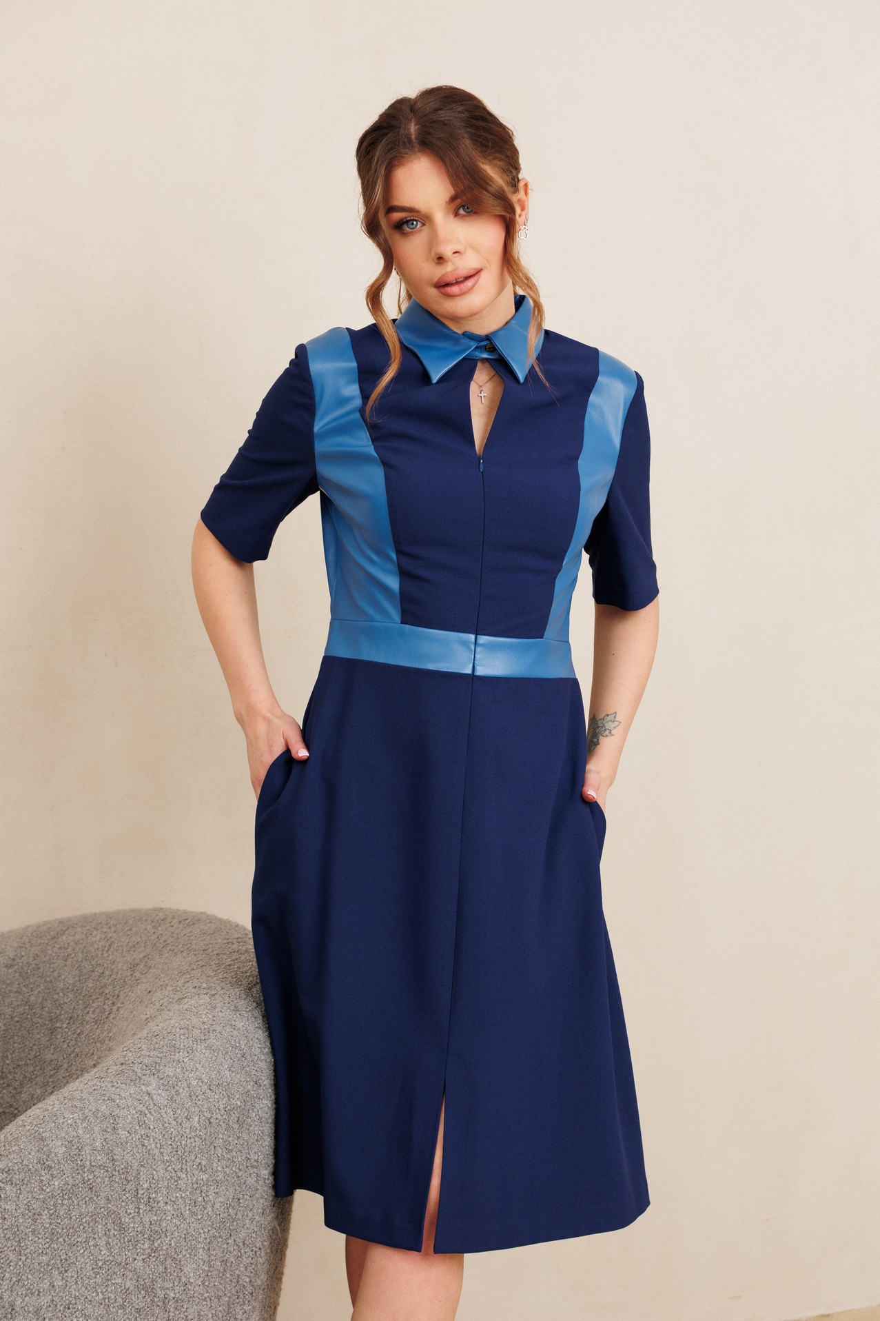 Платье 1000 синий Amori предлагает стиль и комфорт в одной модели. Коллекция бренда Amori удивляет своим современным подходом. Это платье выполнено из качественного полиэстера с добавлением спандекса, что обеспечивает идеальную посадку и долговечность. Прямой фасон и синий цвет делают изделие универсальным выбором для разных случаев. Потайная застежка молния и боковые карманы добавляют практичности, а невысокий разрез спереди придает элегантности. Модель без подкладки, с длиной 106 см, подходит для летнего или весеннего сезона и станет отличным вариантом как для офиса, так и для повседневных выходов. Подчеркивает фигуру и обеспечивает комфорт благодаря длине рукава 27 см.