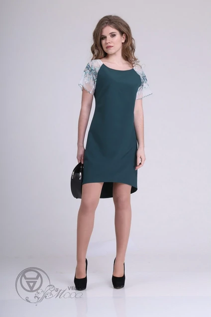 Дл 85 спереди, 96 по синке. Самого модного цвета платье с разновеликой длиной и очень красивым кружевом на рукавчиках.