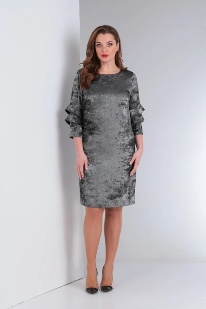 Платье женское,полуприлегающего силуэта. По переду платья нагрудные вытачки, по спинке в среднем шве молния металлическая длиной 50см. Рукав 3/4 ,одношовный с двумя валанами. На подкладке. Ткань с эффектом мерцания.