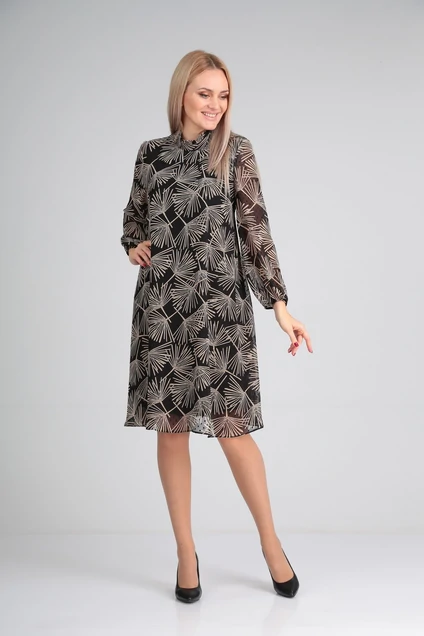 Стильное женское платье расклешёного силуэта с округлоым вырезом горловины на стойке . К стойке воротника пришита декоративная рюша. По спинке платья на стойке две декоративные пуговицы и маленький разрез ввиде капли. Платье шифоновое на трикотажной подкладке. В качестве декоративной отделки служит съёмный пояс. Низ рукава на резинке.