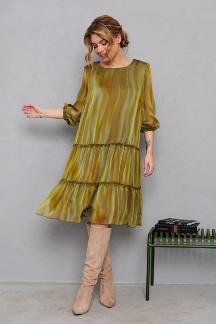 Элегантное шифоновое платье застенчивых оттенков зеленого и желтого цвета, создающее визуальную гармонию и добавляющее образу лёгкости. Удивительная ткань с деликатным принтом в идеальном сочетании с прямым кроем дополнена романтичными воланами на нижней части, придавая изделию женственное очарование. Длинные рукава и застёжка на пуговицу у горловины на спинке обеспечивают практичность и удобство ношения. Подкладка повышает комфорт, делая платье идеальным выбором для особых случаев.