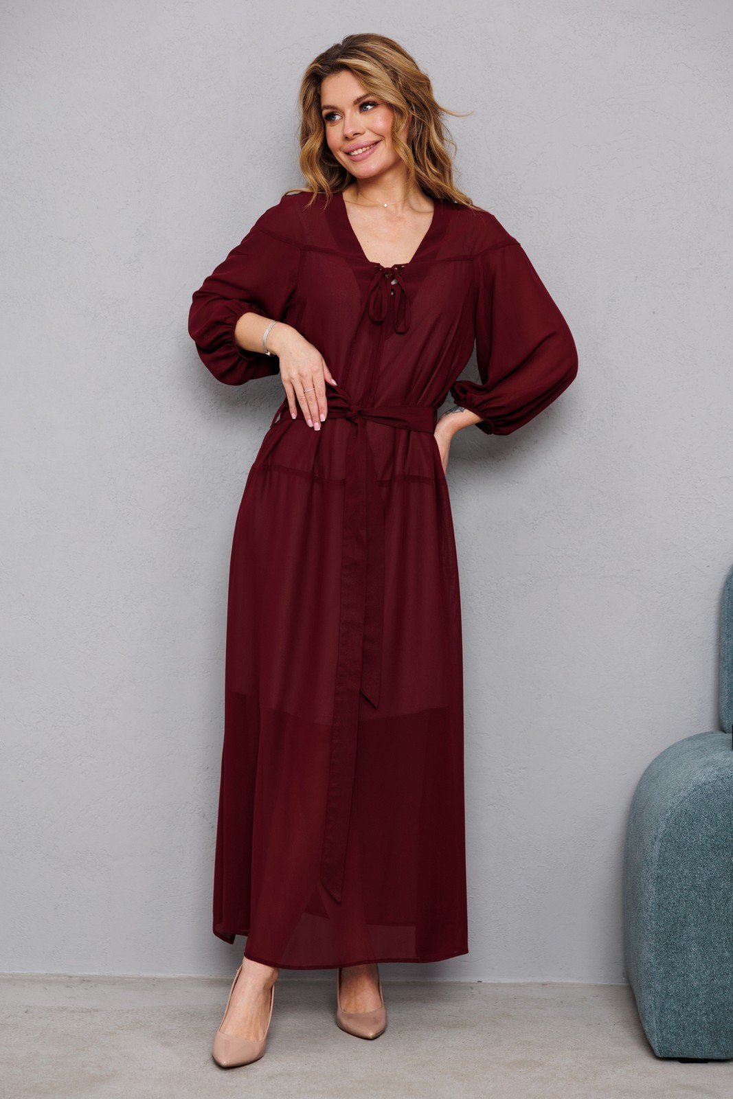 Шикарное шифоновое платье в богатом бордовом цвете, идеально подходит для создания элегантного образа. Дизайн платья включает нежно-прозрачный верхний слой шифона, дополненный эффектными рукавами три четверти и мягкими складками на талии, подчёркивающими силуэт. Съёмный пояс позволяет акцентировать линию талии, позволяя адаптировать стиль под любые предпочтения. Платье комплектуется отдельной подкладкой на регулируемых бретельках, обеспечивая комфорт и непрозрачность. Эта модель станет прекрасным выбором для вечерних выходов или торжественных мероприятий.