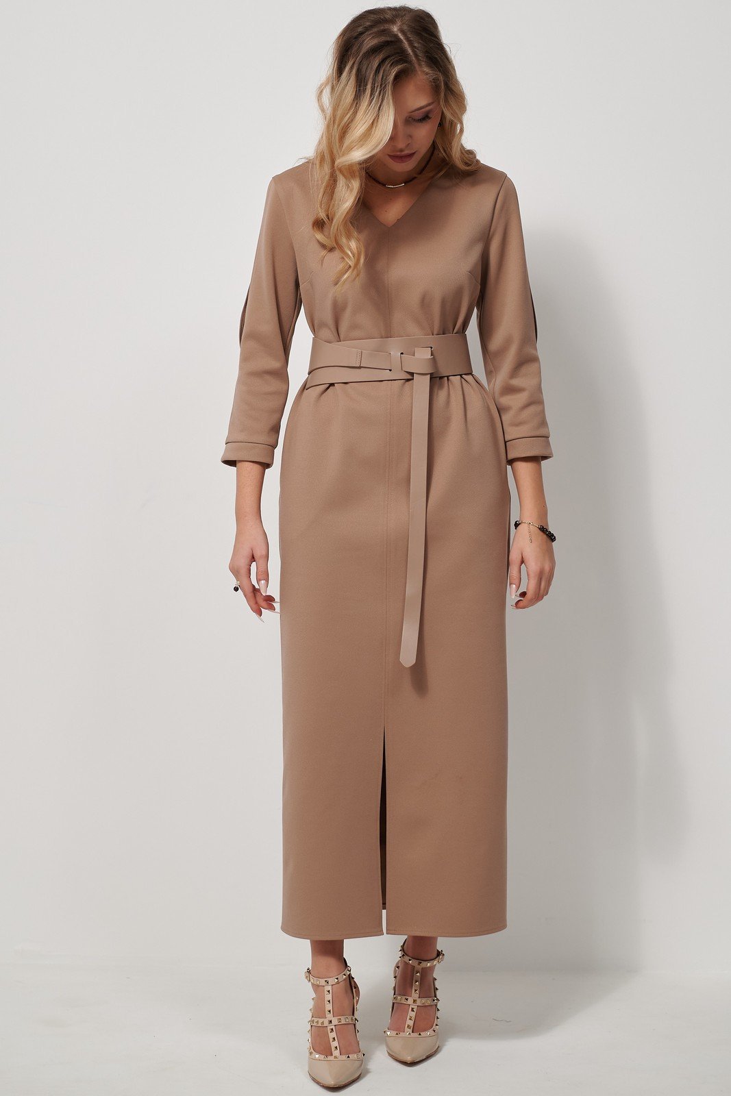 Элегантное платье из мягкого трикотажного полотна в рубчик, представлено в спокойном бежевом оттенке. Модель с прямым силуэтом дополнена V-образной горловиной и втачными рукавами длиной 7/8 с оригинальными разрезами по центру до локтя и притачными манжетами. Изюминка дизайна – средний передний шов с обработанным разрезом по низу и удобная потайная молния на спинке. Платье украшено съемным поясом, подчеркивающим фигуру, что добавляет изделию изысканности и функциональности.