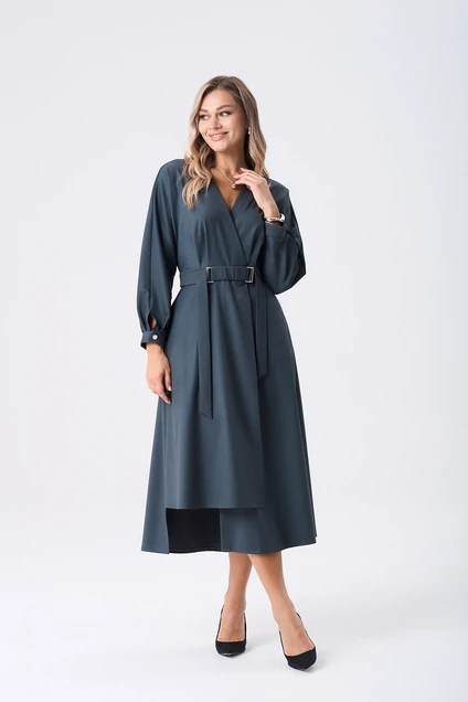 Платье женское полуприлегающего силуэта длинной миди. Платье отрезное по линии талии, на запах, с односторонними складками от пояса. Юбка платья по полочки ассиметричная, слегка расклешённая к низу. По талии приточной пояс, застегивающийся на пришивные кнопки, который дополнен отлетным поясом фиксирующийся рамками. В боковых швах обработаны карманы. Рукава цельнокроеные, по низу притачная манжета, застёгивающаяся на петлю и пуговицу.
