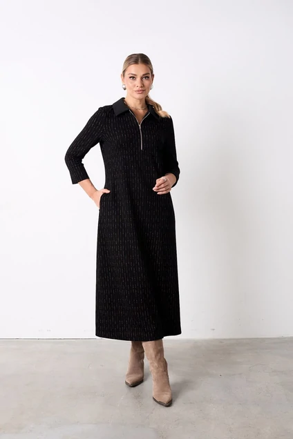 Платье женское полуприлегающего силуэта из мягкого трикотажа. Платье длиной миди, в боковых швах обработаны разрезы. Воротник рубашечный из отделочной однотонной ткани, по полочке вставлена тесьма-молния благодаря чему платье комфортно одевать. В боковых швах обработаны карманы. Рукав втачной длинной ¾, по низу обработана притачная манжета.